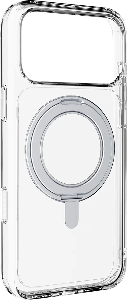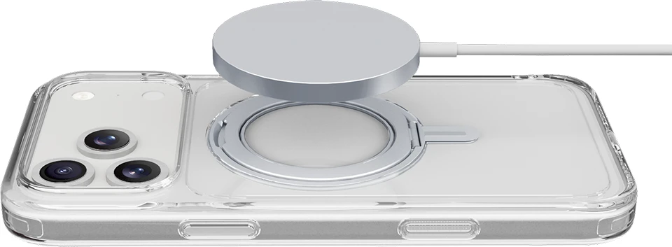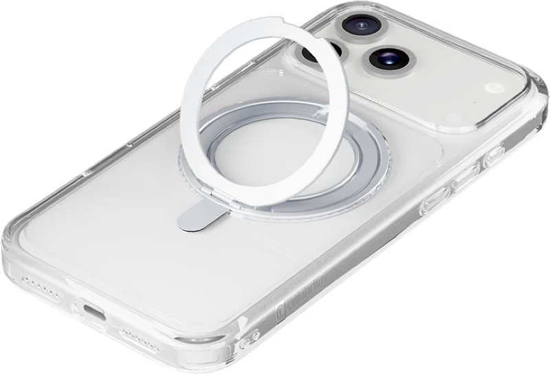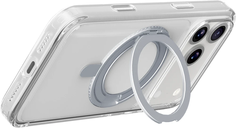 SPIN MAG ist die transparente Hülle mit drehbarem Ständer, die mit dem MagSafe-System kompatibel ist. Es zeichnet sich durch einen um 360 Grad drehbaren Ring aus, der es dem Gehäuse ermöglicht, verschiedene Funktionen wie Stand- und Halterungsfunktionen zu übernehmen. Der Ring ist integriert und wird bei Nichtgebrauch zu einem integralen Bestandteil des Gehäuses, sodass es mit MagSafe-Zubehör kompatibel ist. Die erhöhten Kanten rund um das Display und die Kamerabereiche schützen das Telefon vor versehentlichen Stößen und Stürzen.
